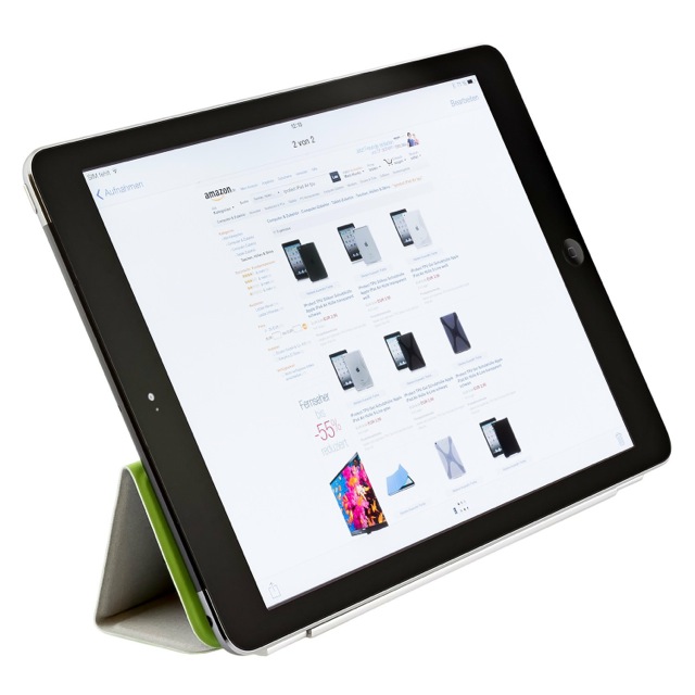 Neben der Schutzfunktion für die Glasfront – hier kann vor allem das automatische An- und Abschalten des iPads überzeugen, kann man das Apple-Tablet durch eine Klappfunktion der Hülle auch aufstellen: Entweder flach zum Tippen, oder steil zum Videos ansehen.