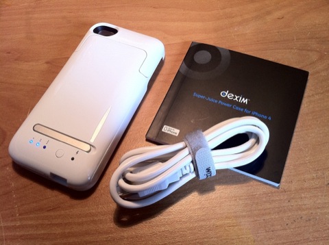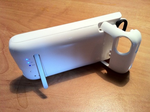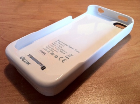 Auch das Dexim bietet einen ähnlichen Komfort: zwar wird es in einem glänzenden Weiß ausgeliefert, aber wiegt ebenfalls weniger als das iPhone selbst, und zwar um die 95 Gramm. Trotz seines zusätzlichen Gewichts verfügt das Dexim Super-Juice Power Case nur über einen eingebauten Akku. Auch hier das übliche Spiel: praktische Durchlässe und Aussparungen an den richtigen Seiten sorgen für eine komplikationslose Nutzung des iPhones auch während es im Case verbleibt. Anders als beim A-Solar-Pack ist hier der obige Deckel fest mit dem Case verbaut und kann zum Entnehmen des Geräts hochgeschoben und nach hinten geklappt werden. Punkten kann das Dexim ganz besonders durch seinen ausklappbaren Standfuss auf der Rückseite, so dass man das iPhone bequem zum Filme gucken aufstellen kann. Auch die obligatorischen LEDs zum Akku- und Ladestatus befinden sich an selbiger Stelle.