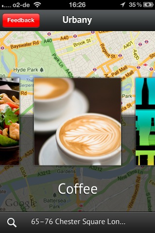 Die Neuerscheinung zählt ganz klar zu den schicker aufgemachten Apps. Bei Urbany sieht man das schon am Icon, auch innerhalb der App wird man nicht enttäuscht. Man lässt sich entweder orten oder gibt eine Adresse ein und schon kann man aus den vier Kategorien Food, Coffee, Drinks und Music wählen, um sich entsprechende Punkte im Umkreis von bis zu zwei Kilometern anzeigen zu lassen.