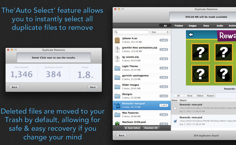 Gerade auf neueren MacBooks, die dank SSD-Speicher eine eingeschränkte Kapazität von 128 oder 256 GB haben, kann unnütz belegter Platz doppelt ärgerlich sein. Besonders bitter ist es, wenn man doppelte Dateien gespeichert hat, diese aber vielleicht nicht bemerkt. Genau dabei können Apps wie zum Beispiel Gemini helfen. Wer dafür aber keine 8,99 Euro ausgeben möchte, kann einen Blick auf Duplicate Detective (Mac Store-Link) werfen, das aktuell für nur 1,79 Euro verkauft wird.
