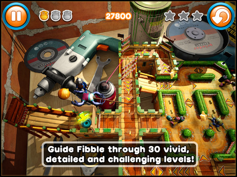 Fibble ist eine Mischung aus Minigolf und Labyrinth. Man zieht den kleinen Rundling mit dem Finger auf und schießt in durch das Level, überspringt mit Hilfe seiner Freunde Hindernisse, sammelt Sterne ein und erreicht mit dem hoffentlich letzten Schwung das Ziel. Feinjustierung kann hier über die Bewegungssensoren vorgenommen werden, um die Richtung noch ein wenig zu beeinflussen.