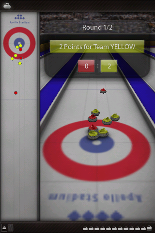 Der Computergegner agiert äußerst geschickt und legt, wie im Curling üblich, zunächst so genannte Guards ab, um das Haus zu schützen oder stößt freiliegende Steine des Spielers gnadenlos aus dem Spielfeld. Leider fehlt uns hier eine Option, um den Schwierigkeitsgrad anzupassen. Immerhin wird eine ausführliche Hilfe geboten, die das Spielprinzip und die Steuerung erklärt. Ebenfalls positiv zu erwähnen ist die Übersichtsleiste am linken Bildschirmrand, mit der das gesamte Spielfeld immer im Blick bleibt, und das gegnerische Runden mit einem kleinen Tap auf den Bildschirm verkürzt werden können.