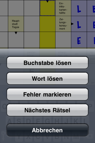 Sollte es einmal nicht weiter gehen, bietet Kreuzworträtsel Pro XL verschiedene Hilfen an. Zum einen kann man einzelne Buchstaben lösen, sich bei einem ganzen Wort helfen lassen oder das aktuelle Rätsel auf Fehler durchsuchen.
