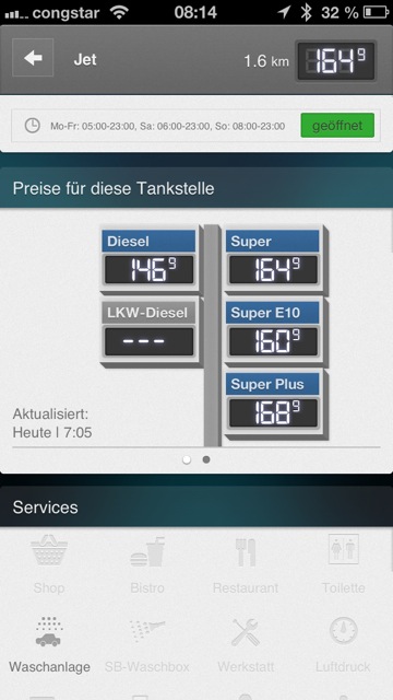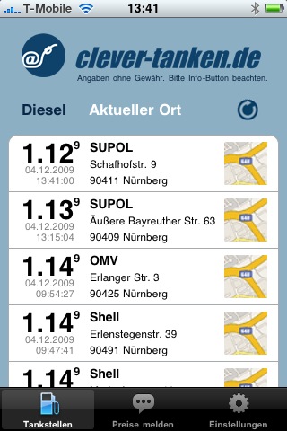 Im Vergleich zur Konkurrenz setzt T-Online bei der TankenApp nicht auf die Hilfe der Nutzer. Innerhalb der App besteht keine Möglichkeit, selbst Preise einer Tankstelle einzutragen. Welche Vor- und Nachteile das hat, dazu später mehr. Zunächst einmal wollen wir die Entwickler selbst zu Wort kommen lassen: „Derzeit bekommen wir alle fünf Minuten neue Daten. Dabei sind mindestens 80 Prozent der Tankstellenpreise unter einer Stunde alt“ heißt es. „Mit der neuen Markttransparenzstelle werden wir alle 60 Sekunden ein Update haben. Wir sind darauf vorbereitet und warten quasi täglich auf das Go.“