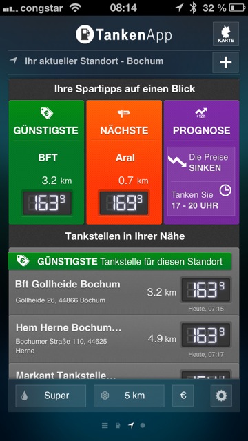Mit einer durchschnittlichen Nutzer-Wertung von nur drei Sternen sieht es für die TankenApp (App Store-Link) momentan alles andere als rosig aus. Die kostenlose iPhone-Applikation könnte sich in Zukunft aber zu einem echten Tipp entwickeln – und schon jetzt hat sie in unserem Test sehr gute Ergebnisse geliefert. Ziel ist es, immer die günstigsten Spritpreise in der Umgebung zu finden, um so möglichst günstig Tanken zu können.