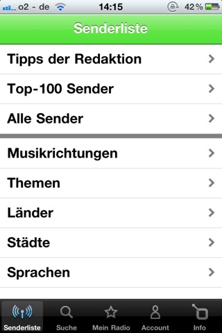 Nach dem Start der App wird man zunächst mit einigen Listen überhäuft, in welche die einzelnen Radiosender eingeordnet sind. Über 4.000 Radiosender sind es insgesamt, die sich dank der Sortierung und der integrierten Suche schnell finden lassen.