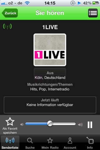 Hat man den gewünschten Sender gefunden, reicht ein einfacher Klick, um die Wiedergabe zu starten. Der laufende Sender wird auf einer „Sie hören“-Seite angezeigt, inklusive Logo, Musikrichtung und einer Anzeige „Jetzt läuft“. Diese bleibt leider oft leer, was sehr schade. Wenn die Musikinformation verfügbar ist, wird zudem ein Link in den iTunes Store eingeblendet, damit man sich den Song bei Gefallen direkt laden kann.