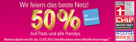 Das Angebot ist jetzt gültig! Die Telekom feiert unter dem Motto „Wir feiern das beste Netz“ und gewährt den Kunden vom 09. Mai bis zum 12. Mai 50 Prozent Rabatt auf den iPhone- und iPad-Preis (Zur Angebots-Webseite).