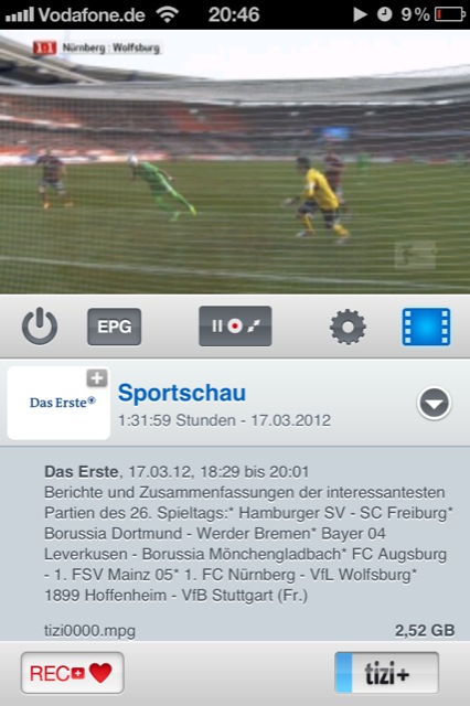 Um die aufgenommenen Sendungen auf iPhone oder iPad abzuspielen, verbindet sich Tizi+ entweder mit einem vorhandenen WLAN (diese Funktion kann in den Einstellungen aktiviert werden, und nennt sich „Tizi@Home“), oder kann den eigenen integrierten Hotspot zum Übertragen nutzen – letzteres genauso wie beim Live-Fernsehen unterwegs. Wer Tizi+ auf dem iPad bequem fernsteuern möchte, findet im App Store noch die gratis verfügbare Tizi Remote für das iPhone.