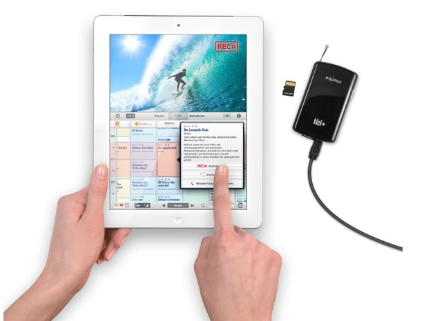 Nun hat Equinux vor kurzem ein erweitertes Nachfolgemodell auf den Markt gebracht, den Tizi+, der neben den üblichen Funktionen des Tizi auch noch als voll-digitaler Videorecorder fungieren kann – und das ganz unabhängig von den jeweiligen iDevices oder dem Mac. Equinux bietet Interessierten zur Einführung des Tizi+ ein lohnenswertes Angebot: Zur Zeit bekommt man für 179,99 Euro (Amazon-Link) nicht nur den Tizi+ selbst, sondern zusätzlich auch noch eine 16 GB MicroSD-Karte zum Speichern der aufgenommenen Sendungen, sowie das Tizi-Netzteil für eine ständige Stromversorgung.