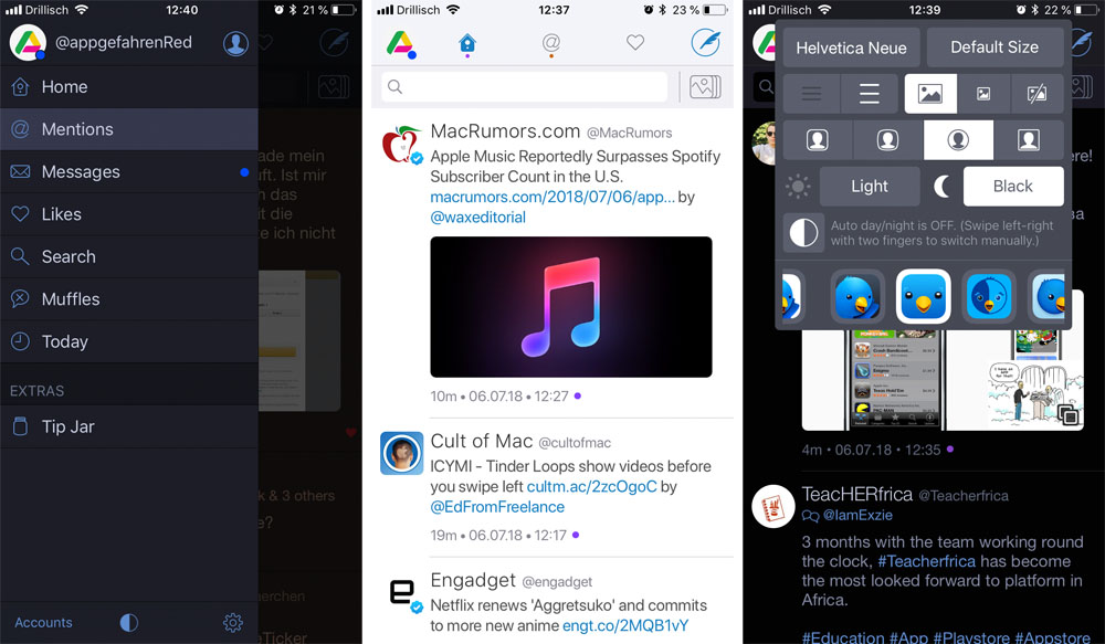 Natürlich verfügt Tweetbot 4 über eine deutsche Lokalisierung und kann so ohne Einschränkungen genutzt werden, wobei wir davon ausgehen, dass sich in den meisten Twitter-Feeds ohnehin auch englische Inhalte verstecken. Aber letztlich ist eine gute deutsche Beschriftung von Buttons und Menüpunkten dann doch etwas angenehmer.