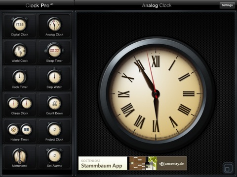 Clock Pro HD bietet mehr als nur eine Uhr an. Insgesamt stehen 13 Funktionen zur Verfügung. Unter anderem gibt es natürlich eine Weltuhr, eine Stoppuhr, einen Timer sowie die Unterscheidung zwischen einer analogen oder digitalen Uhr. Außerdem bringt die App ein Metronom mit sich, eine Projekt-Uhr und einen Sleep-Timer.