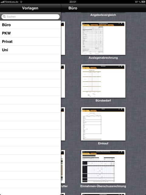Nach dem Start der App entscheidet sich der Anwender per Fingerzeig, ob er die Vorlagen für Keynote, Pages oder Numbers sichten möchte. Alle Vorlagen sind übersichtlich in Kategorien eingeteilt. Bei Pages heißen sie etwa “Beruf”, “Offiziell”, “Privat”, “Reden”, “Rezepte” und “Verträge.” Allein bei den Verträgen finden sich viele ausformulierte Muster etwa zu einem Arbeitsvertrag, einem Bürgschaftsvertrag, einem Darlehensvertrag, einem Ehevertrag mit Gütertrennung, einem Mietvertrag oder einem Schenkungsvertrag. Wer nicht durch die einzelnen Menüs blättern möchte, nutzt die Suche.