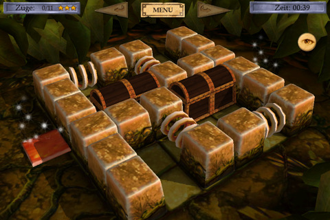 In einem kleinen Feld ist mindestens eine Schatztruhe platziert, die zum Ausgang geschoben werden muss. Klingt zunächst ganz einfach, ist es aber nicht: Blöcke versperren den Weg und müssen zunächst zur Seite geschafft werden, damit die Schatztruhe freie Bahn hat.