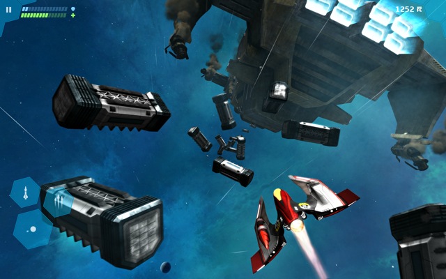 Insgesamt gibt es fünf einzigartige Welten mit jeweils vier Leveln. Im ganzen Spiel warten fünf Bosse darauf besiegt zu werden. Außerdem verfügt das Spiel über passende Musik, wie auch spezielle Sounds. Durch die Game Center-Anbindung sieht man immer, wer gerade der beste Weltraumpilot ist. Folgend ein paar Eindrücke des Spiels, das mit 79 Cent nicht besonders teuer ist.