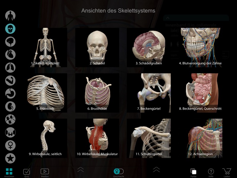 Der Atlas der menschlichen Anatomie ist der am meist eingesetzte 3D-Atlas an Hochschulen und Universitäten, und wurde von Experten im Bereich der Anatomiedarstellung entwickelt sowie von Anatomen und Fachkräften im Gesundheitswesen geprüft. Die männlichen und weiblichen 3D-Modelle verfügen jeweils über 4600 Strukturen sowie 3D-Mikroanatomiemodelle, einschließlich Auge, Ohr, Haut und Zunge. Zu jedem Modell, Knochen, Struktur und mehr gibt es Referenzinformationen, die lateinische Bezeichnung und die anatomische Gruppierung.