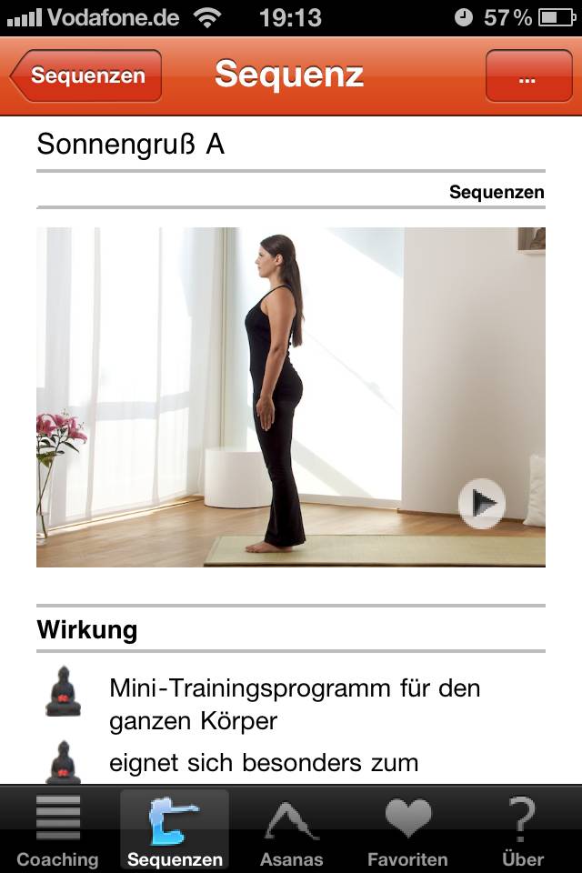 Wechselt man nun in die Datenbank, in der sich über 300 Übungen inklusive 30 Atemübungen befinden, kann man diese nach leicht, mittel und schwer sortieren lassen. So findet man auf einem Blick die passenden Übungen. Auch hier findet man die genannten Informationen zu jeder Übung.