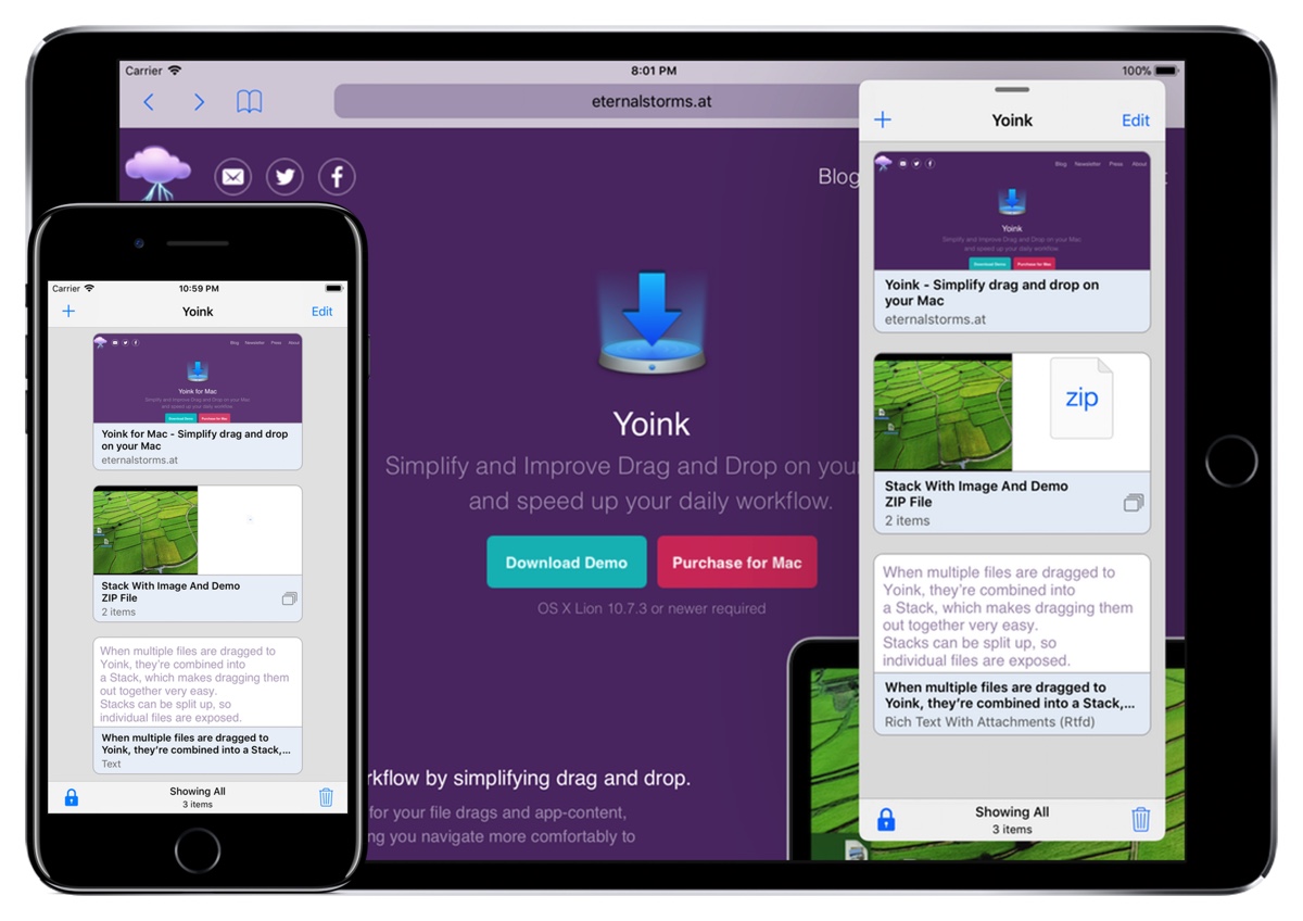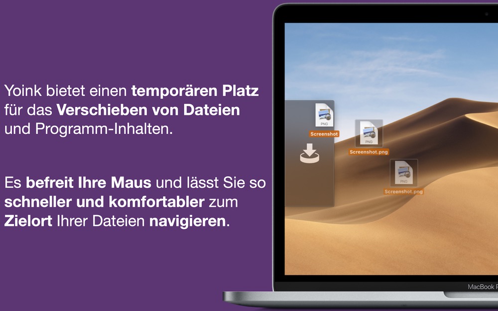 Yoink (Mac App Store-Link) ist eine kleine Mac-Applikation von nur 1,9 MB, die sich dank eines Update-Rabatts momentan für nur 1,79 Euro aus dem deutschen Mac App Store laden lässt. Für die Installation sollte man mindestens über OS X 10.7.3 sowie einen 64-Bit-Prozessor verfügen, empfohlen wird laut Angaben des Developers Matthias Gansrigler aber OS X Yosemite. Yoink lässt sich bequem in deutscher Sprache nutzen.