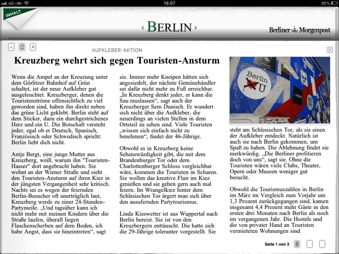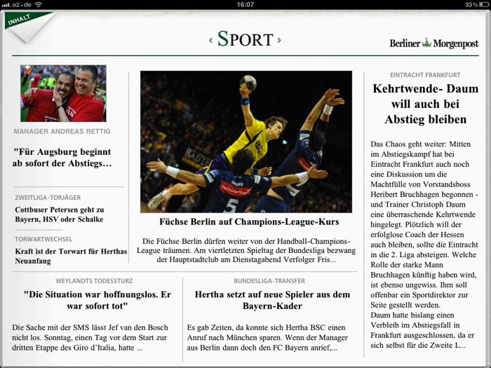 Natürlich dreht sich in der Morgenpost HD vieles um regionale Nachrichten aus Berlin und Brandenburg. Es gibt einen eigenen Regionalteil und im Sport stehen die Hertha und Union im Mittelpunkt. Inhaltlich und redaktionell gibt es hier nichts zu bemängeln, auch Nachrichten aus aller Welt finden ihren Platz. Auch der Querformat-Modus, einer der Kritikpunkte bei „Die Welt“, ist hier gut umgesetzt worden. Das Layout ist leicht abgeändert und die Schriften der einzelnen Hauptseiten sind scharf und leserlich.