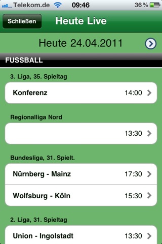 Die 5,2MB kleine Applikation bietet noch viele weitere Features. Im eigentlichen Menü, was man von der Starseite aus unten rechts erreicht, werden nochmals alle Kategorien aufgelistet. Hier findet man zusätzlich einen Twitter-Stream, aktuelle Ergebnisse und Tabellen aus der Formel 1 und dem Fußball, das Wetter und vieles mehr. Klickt man hier auf den Bearbeiten-Knopf, kann man alle Einträge individuell verschieben. Es können dabei sogar die Icons im Dock ausgetauscht werden.