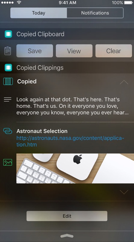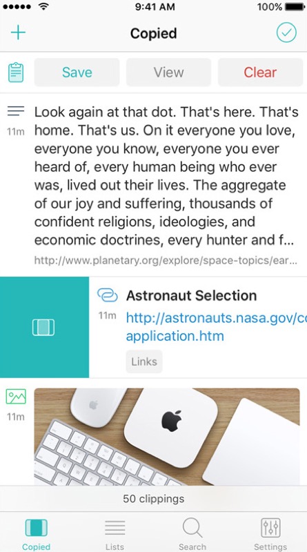 Mit Copied lässt sich die Zwischenablage unter iOS und OS X bequem verwalten und sogar noch einige praktische Zusatzfeatures nutzen, die werksseitig leider in dieser Form von Apple nicht angeboten werden. So können zum Beispiel verschiedene Formate in der Zwischenablage gesichert werden, darunter Text, Links und Bilder als jpeg, png, bmp, gif und tiff. Besonders praktisch: Die Inhalte der Zwischenablage können editiert oder mehrere sogenannte „Clippings“ zu einem einzigen zusammengeführt werden.