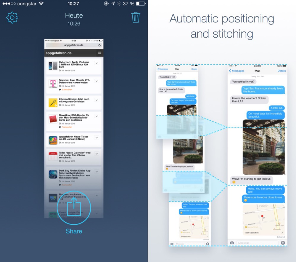 Die zusammengesetzten Bildschirmaufnahmen können in der Bibliothek abgelegt oder direkt per Mail exportiert werden. Optional ist das Teilen auf Facebook, Twitter und Co möglich. Durch den kostenlosen Download wird an den Screenshot automatisch ein Wasserzeichen am untersten Rand angehangen, der optional per 2,99 Euro teuren In-App-Kauf deaktiviert werden kann. Wer möchte kann diesen Zusatz auch manuell abschneiden…