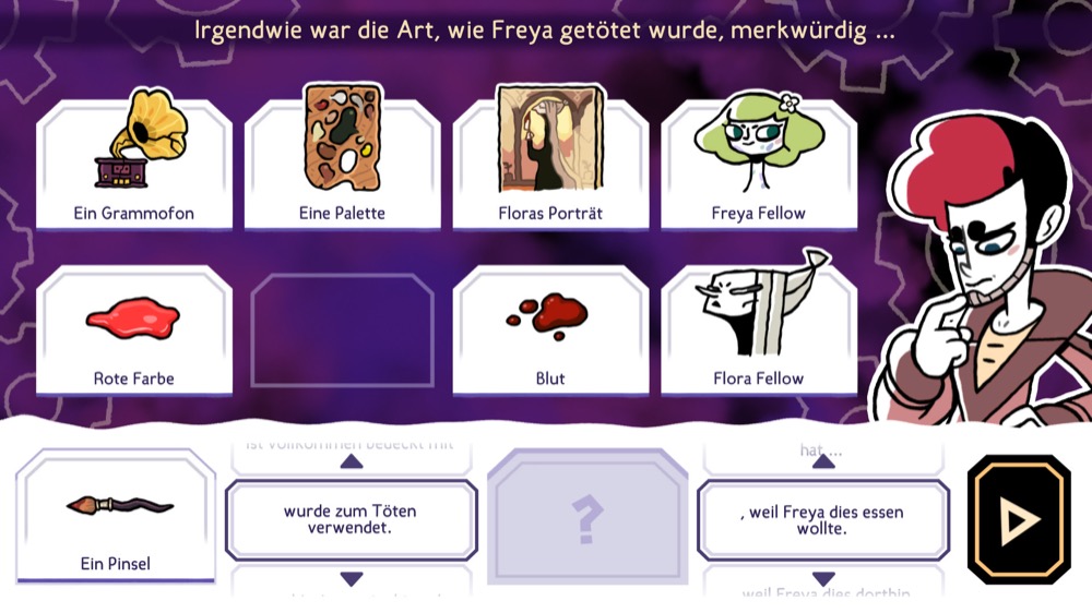 Doch worum geht es eigentlich in Tangle Tower? Als Detektiv Grimoire wird man mit einem merkwürdigen Mordfall betraut: Freya Fellow wurde getötet. Die Hauptverdächtige ist eine schattenhafte Gestalt, die mit gezücktem Messer vor ihrer Leiche steht. Das Problem an dieser Sache: Die Verdächtige ist nur ein Gemälde.