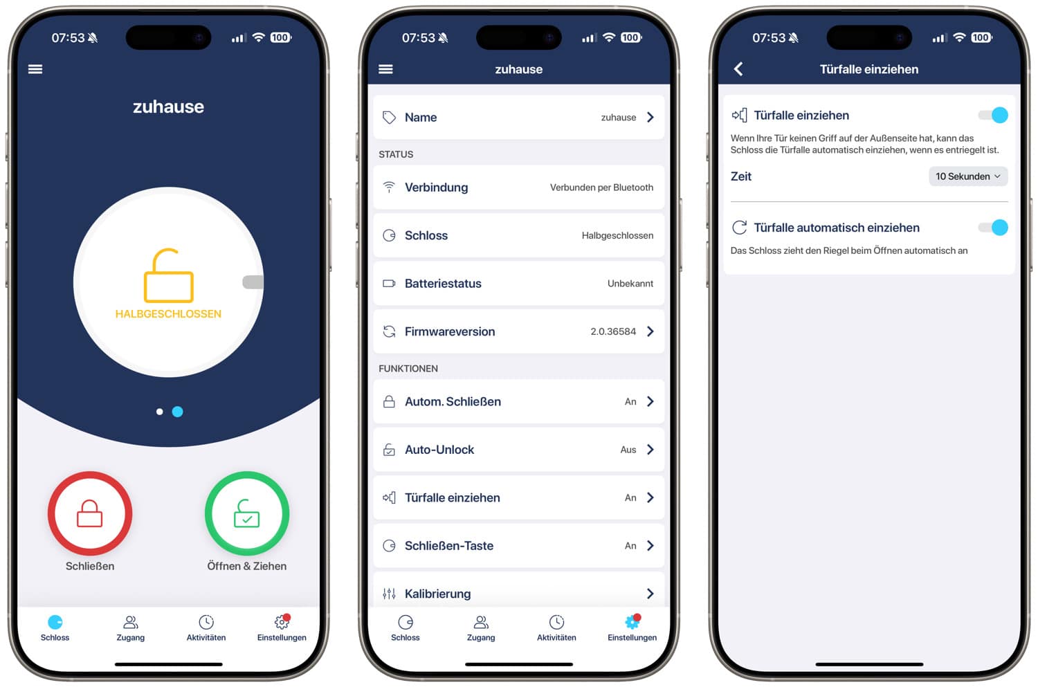 - Türfalle ziehen: Um die Tür zu öffnen, muss man natürlich die Türfalle ziehen. Optional kann man in der App festlegen, dass die Falle nicht gezogen und nur das Schloss gedreht wird.