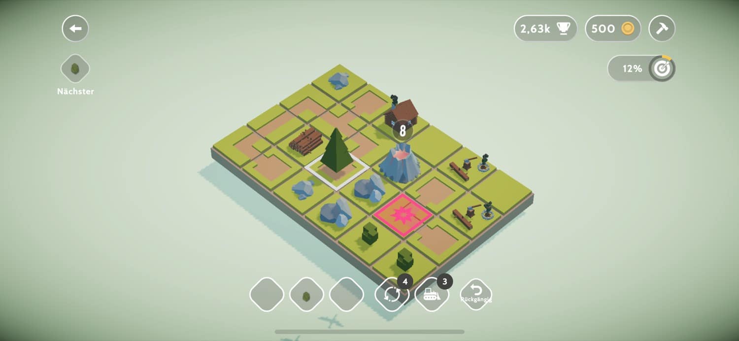 Bevor wir zu großen Update auf Version 2.0 kommen, möchten wir Teeny Tiny Town noch einmal kurz erklären. In Teeny Tiny Town erschafft ihr eure eigene kleine Stadt und müsst dafür immer drei gleiche Objekte miteinander kombinieren. Aus drei Sträuchern wird eine Tanne, aus drei Tannen ein Sägewerk und aus drei Sägewerken gibt es Holz. Aus drei Holz-Feldern entsteht dann eine rustikale Hütte. Es folgen ein behagliches Haus, ein Wohnhaus und ein größeres Wohnhaus. So geht es immer weiter, bis ihr eine tolle kleine Stadt erschaffen habt.