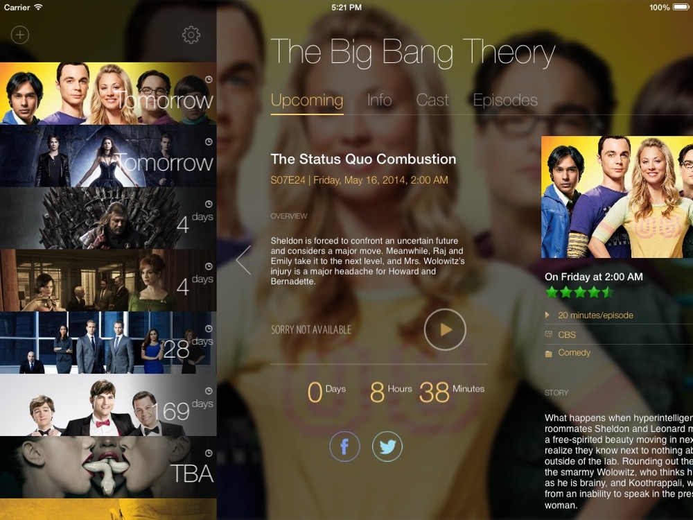 In TeeVee 3 (App Store-Link) könnt ihr eure Lieblingsserien suchen und speichern. Diese werden mit allen Episoden und Ausstrahlungsterminen (leider nur die amerikanischen) angezeigt, auch eine Zusammenfassung ist verfügbar. Mit einem Klick lässt sich eine Episode als gesehen markieren, so dass ihr immer den Überblick wahren könnt. Insgesamt sind über 30.000 TV-Serien in der Datenbank zu finden, wobei die favorisierten Sendungen per iCloud zwischen iPhone und iPad abgeglichen werden.