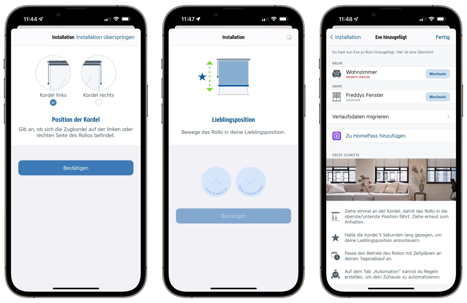 In der Kalibrierung legt man drei Positionen fest: Die oberste und unterste Position sowie eine Lieblingsposition. Letztere kann einfach durch einen langen Zug am Seil gewählt werden, was wir als wirklich praktisch empfinden. Mit einem kurzen Zug am Seil wird das Rollo komplett nach oben oder unten gefahren. Alternativ kann man die Rollos mit der Eve MotionBlinds Technik, die übrigens per Bluetooth und Thread funktioniert, per App, Siri oder Automation steuern.