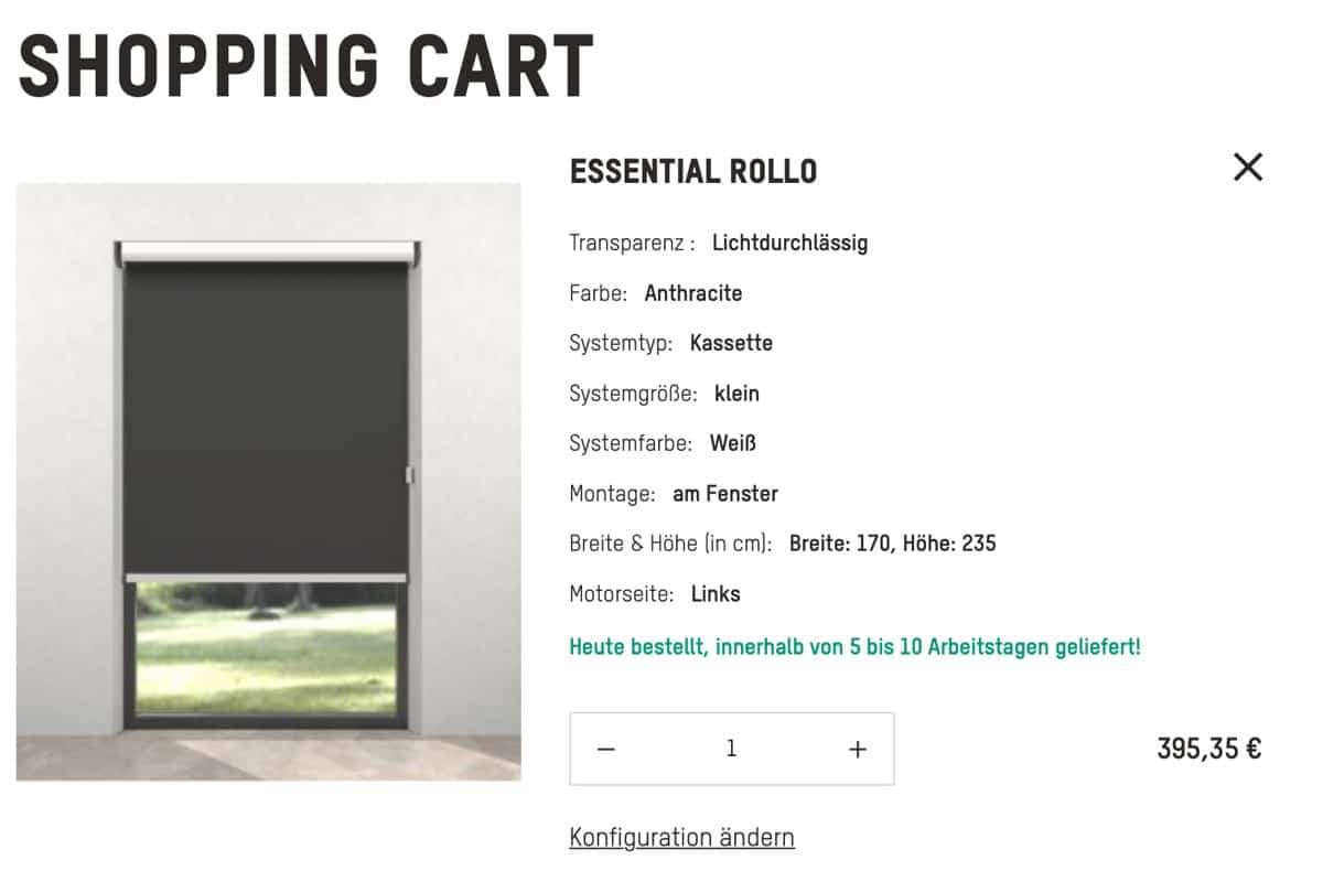 Ich kann bereits vorwegnehmen: Am Ende wird sich sicherlich alles um den Preis drehen. Und hier gibt es durchaus einige Dinge zu beachten, wie beispielsweise die 10 Prozent Rabatt, die bei Smartblinds aktuell im Warenkorb abgezogen werden. Die von uns gewählten Rollos haben selbst mit diesem Rabatt aber immer noch rund 360 Euro gekostet – pro Stück.