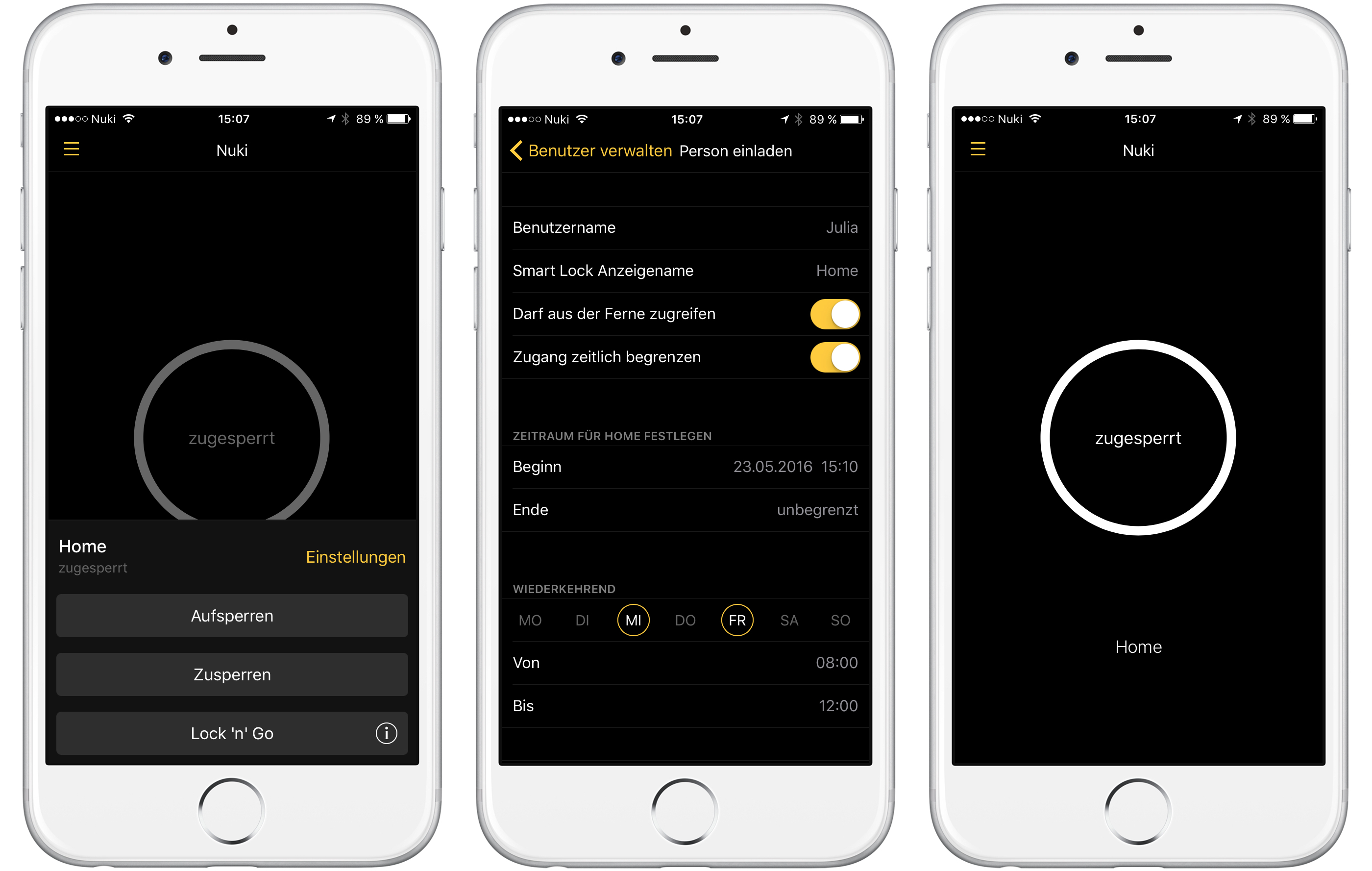 Des Weiteren könnt ihr Zugangsberechtigungen verteilen. Soll die Freundin, der Partner oder der Mitbewohner auch die Tür per Smartphone öffnen können, kann ein Einladungscode verschickt werden, der den Zugriff auf das Smart Lock erlaubt. Diese Berechtigung kann auch wieder vom Besitzer entzogen werden. Zudem gibt es ein Sperrprotokoll, das genau zeigt, wann und wer die Tür aufgesperrt oder verschlossen hat. Die Apple Watch-App lässt leider noch auf sich warten.