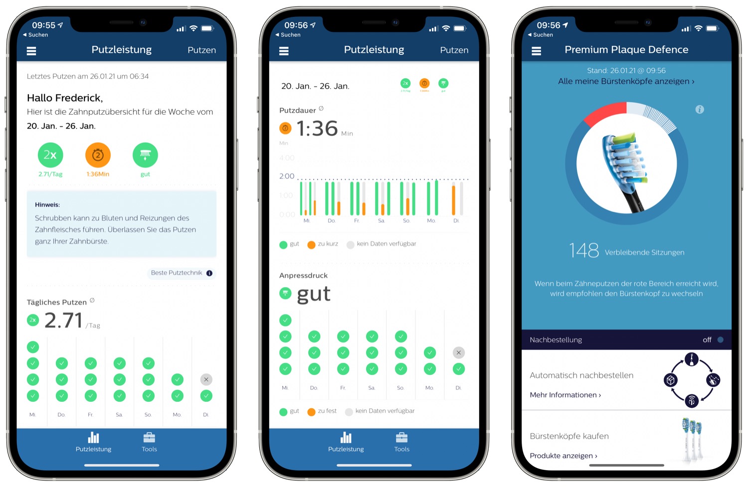 Die Philips Sonicare DiamondClean 9000 kann mit der Sonicare-App (App Store-Link) über Bluetooth verbunden werden. In der App könnt ihr eure Putzleistung pro Woche einsehen, wobei hier nur dargestellt wird wie oft und wie lange ihr geputzt habt. Gleichzeitig misst die Zahnbürste den Anpressdruck und gibt an ob dieser gut oder zu fest ist. Des Weiteren könnt ihr einsehen, wann ihr euren Bürstenkopf ersetzen solltet. Über die App kann man auch direkt eine Bestellung aufgeben oder sogar ein Bürstenkopf-Abo abschließen.