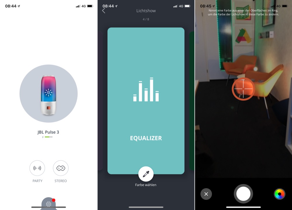 Die Einrichtung ist auch beim JBL Pulse 3 kinderleicht. Direkt nach dem ersten Start befindet sich der Speaker im Kopplungsmodus und kann bis zu drei Smartphones oder Tablets per Bluetooth koppeln. In der JBL Connect-App könnt ihr nicht nur den Akkustatus einsehen, sondern auch die Lichteffekte ändern und personalisieren.