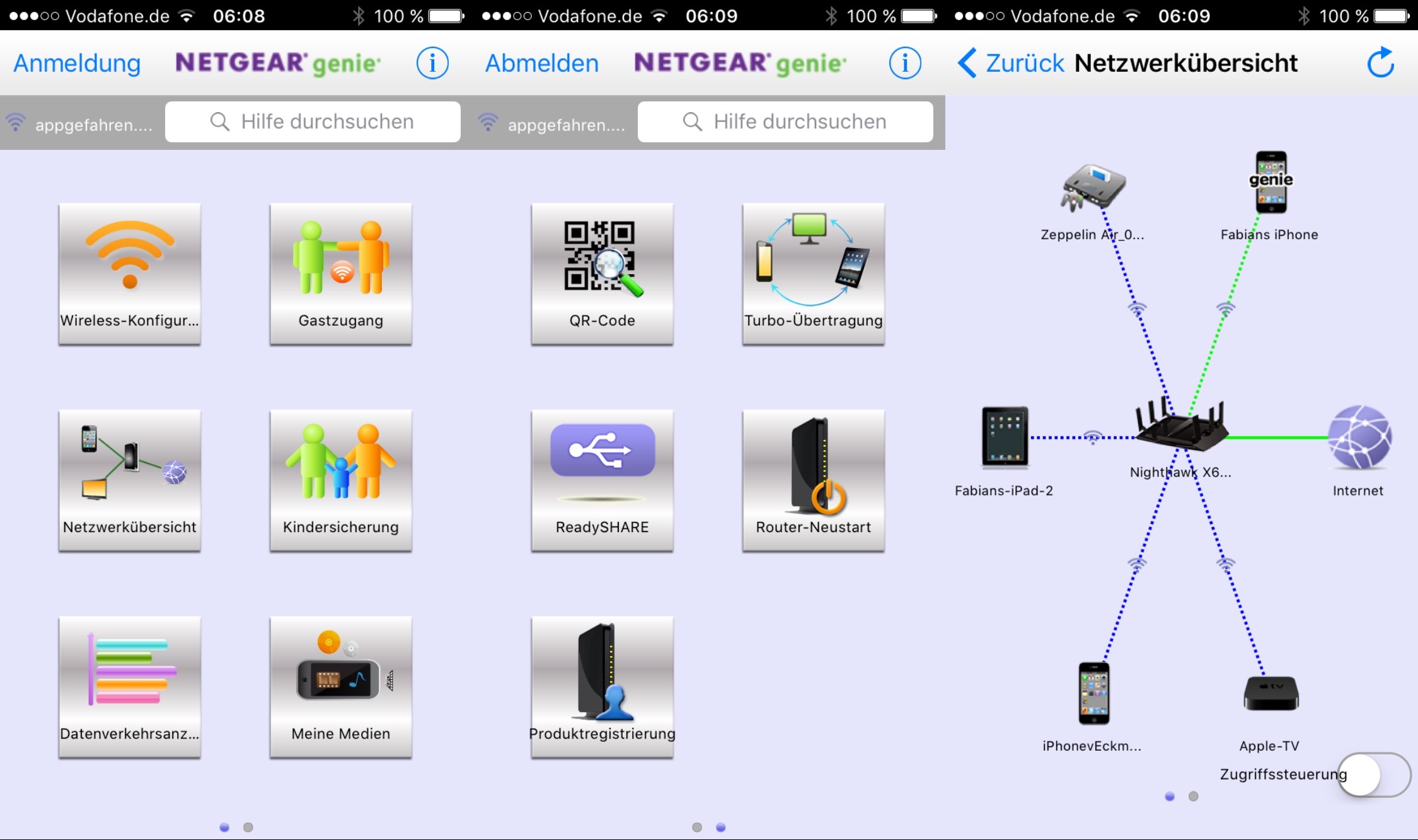 Noch schlimmer sieht es auf dem iPhone aus: Netgear Genie (App Store-Link), so nennt sich die App des Herstellers, ist nicht für die Auflösung des iPhone 6 optimiert und sieht auch sonst nicht nach dem aus, was man sich unter einer modernen App für iOS vorstellt. Immerhin: Es ist ein problemloser Zugriff auf alle zahlreiche Informationen und die wichtigsten Einstellungen möglich. Trotzdem würde es nicht schaden, wenn Netgear seine Genie-App einer Frischzellenkur unterziehen würde.