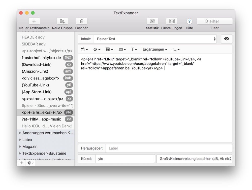 Laut Statistik, die leider zwischendurch gelöscht wurde, habe ich insgesamt 9591 Textbausteine eingefügt und somit 350.699 Zeichen gespart – in Zeit sind das mehr als 14 Stunden. Einer meiner meistgenutzten Textbausteine ist der Shortcut „apl“ für (App Store-Link) oder „yte“ zum Einbinden von YouTube-Videos mit HTML-Code. Die Neuerungen in Version 6 sind überschaubar (neuer Cloud-Sync, überarbeitetes Design, Touch Bar-Support), genau aus diesem Grund werde ich auch weiterhin Version 5 nutzen, die auf monatliche Kosten verzichtet und weiterhin uneingeschränkt funktioniert.