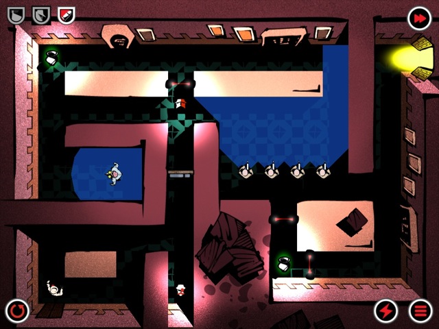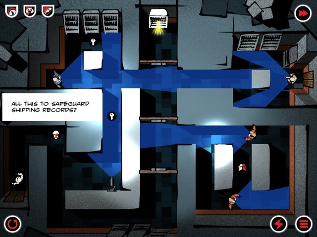 Unterwegs heißt es daher nicht nur, sich vor den Horden von Feinden zu verstecken und unerkannt ins Ziel zu laufen, sondern auch bestimmte Ziele in jedem Level zu erreichen. So gibt es unter anderem Sonderauszeichnungen für Versuche, die mit einem einzigen durchgehenden Weg oder auch innerhalb einer bestimmten Zeit absolviert worden sind. Denn: Rothko lässt sich einfach über auf dem Screen eingezeichnete Routen fortbewegen. Diese können nur wenige Schritte lang sein, aber auch gleich einen Weg durch ein gesamtes Level markieren. Rothko folgt der eingezeichneten Route ohne Pause, es sei denn, es wird eine Richtungsänderung auf den Screen gemalt. Auf diese Weise durchschreitet der Kriminelle auch Laserbarrieren oder sammelt Gegenstände im vorbeilaufen ein.