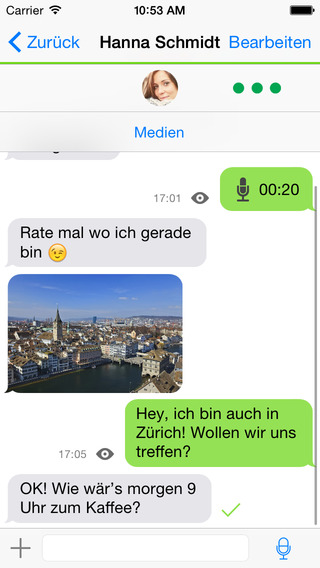 Ansonsten hat Threema aber schon einiges auf dem Kasten: Ihr könnt Fotos und Videos versenden, euren Standort teilen oder von der innovativen Abstimmfunktion Gebrauch machen. Selbstverständlich kann man auch mit mehreren Freunden gleichzeitig in einem Gruppenchat schreiben oder kurze Sprachnachrichten versenden.