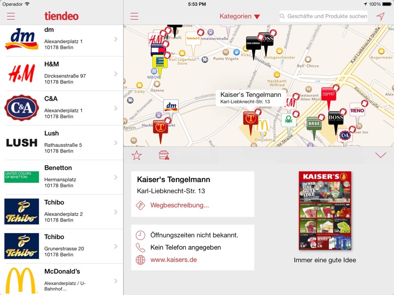Neben der Anzeige aktueller Prospekte kann man sich auch bei Tiendeo auf eine gezielte Suche nach Angeboten machen, entweder über eine integrierte Suchfunktion, durch das Festlegen von Favoriten-Geschäften oder auch in einer „Geschäfte“-Übersicht, in der sich Einkaufsmöglichkeiten auf einer Karte einsehen und, sofern vorhanden, auch gleich aktuelle Prospekte anzeigen lassen. Praktischerweise gibt es für jedes auf der Karte aufgeführte Geschäft auch Zusatzinfos wie die genaue Adresse, die Öffnungszeiten und die Telefonnummer. Diese Informationen sind allerdings nicht bei jedem Anbieter vorhanden.