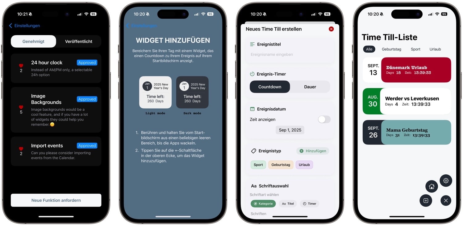 Wer möchte, kann sogar aktiv zur weiteren Entwicklung von TimeTill beitragen: Dazu nutzt man einfach die in den Einstellungen der App vorhandene Option, neue gewünschte Features einzureichen oder über bereits geplante abzustimmen. Wenn ihr Interesse an TimeTill habt, solltet ihr den Download-Button bald tätigen: Der Entwickler hat mitgeteilt, dass der Lifetime-In-App-Kauf nur noch heute am 25. August 2025 kostenlos sein wird. Wenn euch TimeTill gefällt, hinterlasst auch gerne ein Feedback an Andrii Kolisnyk oder eine gute Bewertung im App Store.