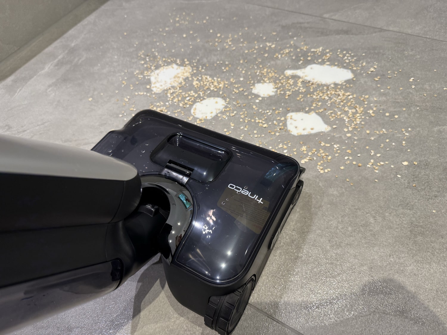 Für den Reinigungstest habe ich aus Versehen mein Müsli mit Milch verschüttet und der Tineco Floor One S9 Artist saugt und wischt mein Missgeschick mit nur einer Überfahrt auf. Wollmäuse und Schmutz werden in diesem Durchgang natürlich mit entfernt. Im Härtetest, das ist angetrockneter Ketchup, hat der S9 Artist ebenfalls eine gute Figur gemacht, allerdings muss man ein paar mehr Überfahrten einrechnen. Auf heißes Wasser bei der Reinigung muss man verzichten.