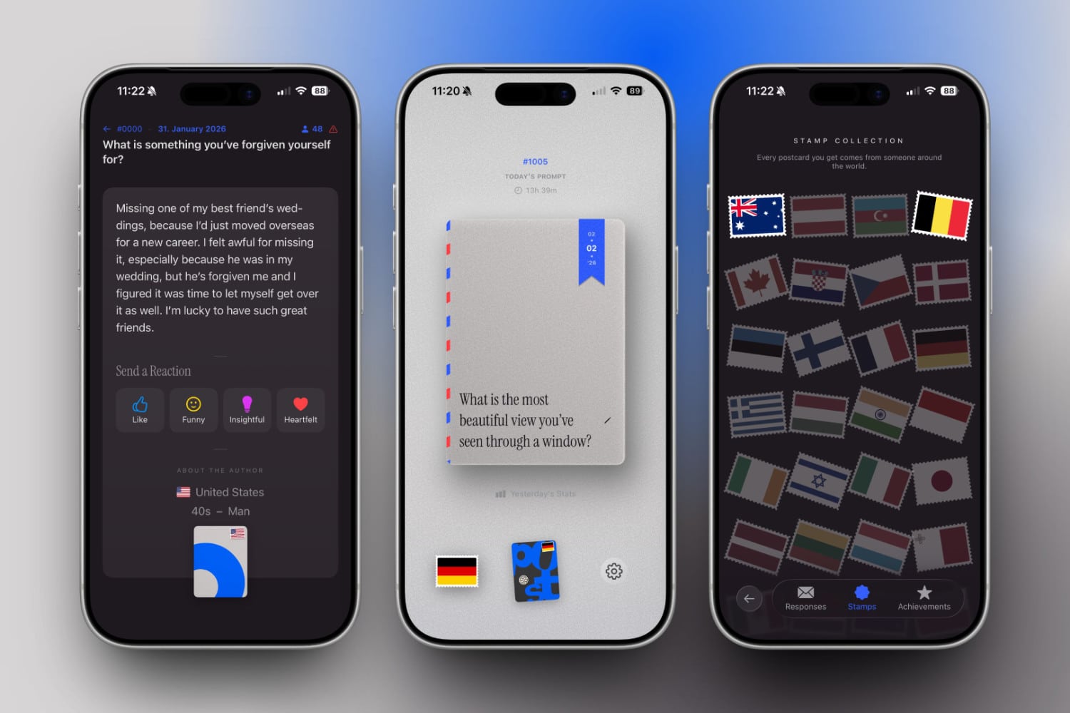 „Eine Frage. Einmal am Tag. Weltweit. Beantworte jeden Tag eine neue Frage und sende deine Gedanken als Postkarte in die Welt. Am nächsten Tag erhältst du anonym die Geschichte einer anderen Person von irgendwo auf der Welt. Sende eine kurze Antwort, um dem Verfasser mitzuteilen, dass seine Worte dich erreicht haben.“