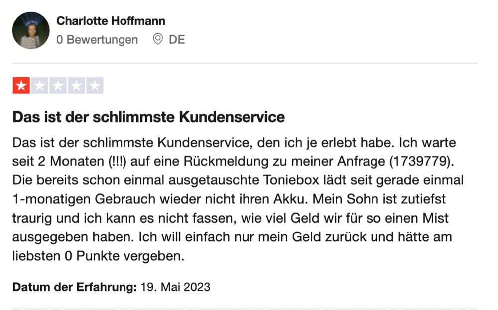 Meine Schwester wollte zusammen mit ihrem Sohn Anfang des Jahres eine vom Hersteller generalüberholte und verkaufte Toniebox in Betrieb nehmen, der Lautsprecher konnte allerdings nicht aufgeladen werden. Erst durch meine Mithilfe kam es zu einem (erst dann) schnellen Austausch. Die neue Toniebox lief nun gerade mal einen Monat – und schon wieder gab es Probleme mit der Aufladung. Sie wartet nun schon wieder seit Wochen auf eine Rückmeldung vom Support.