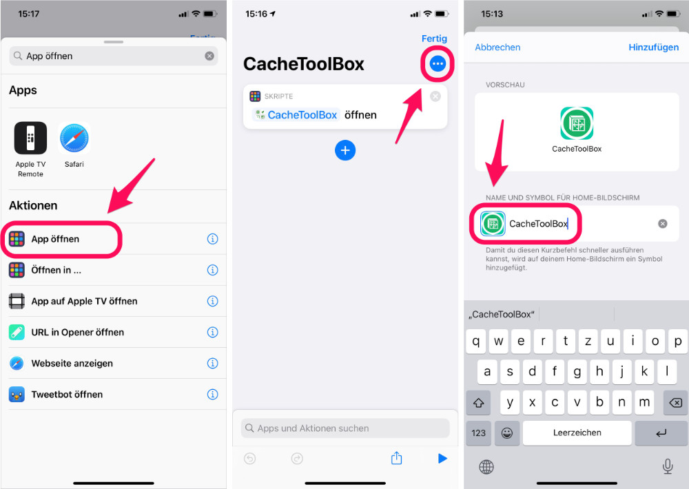 - Im Kurzbefehl-Screen oben rechts auf die drei Punkte tippen