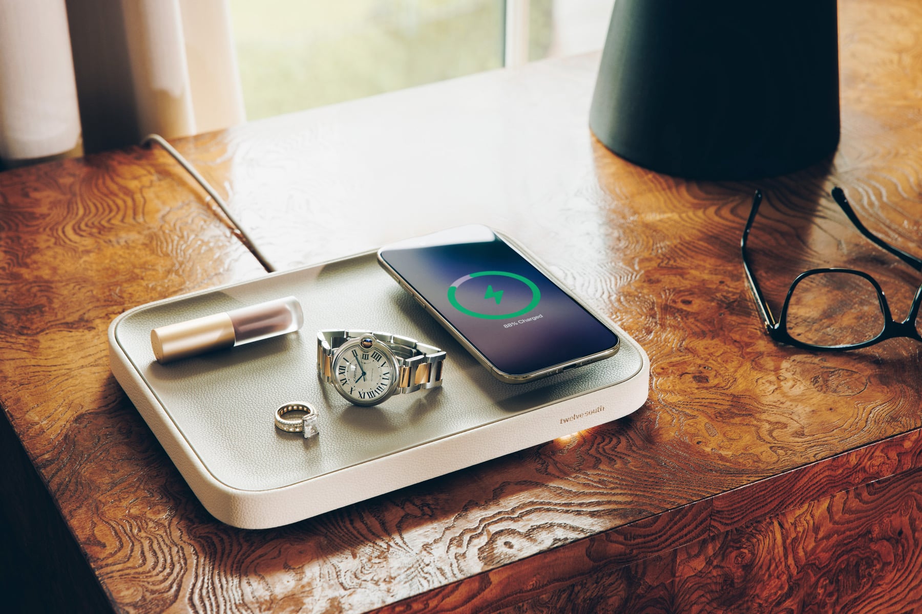 Weil es sich um eine großflächige Design-Ablage handelt, finden hier problemlos weitere Alltagsgegenstände Platz, etwa eine Uhr, Ringe, AirPods oder andere Accessoires. Insgesamt wirkt das Twelve South Valet dadurch weniger wie klassische Technik, sondern vielmehr wie ein hochwertiges Wohnaccessoire.