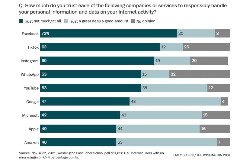 Die Washington Post, eine große US-amerikanische Zeitung, hat eine Umfrage mit mehr als 1.000 beteiligten Internet-Usern aus den USA unternommen. In dieser wurden die Personen gefragt, wie sehr sie den aufgeführten Unternehmen oder Services vertrauten, ihre persönlichen Daten und Informationen zu ihrer Internetnutzung verantwortungsvoll zu behandeln.