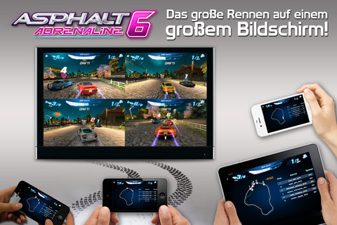 Mit der heute erschienenen Version 1.3.4 kann man Asphalt 6 auch endlich auf dem heimischen und großen Fernseher zocken. Sowohl der Einzel- als auch der Mehrspielermodus werden unterstützt. Entweder man schließt sein iPhone oder iPad mit einem HDMI-Adapter (Amazon-Link) an den Fernseher an oder nutzt einfach AirPlay via AppleTV (Amazon-Link). Letzteres ist mit knapp 120 Euro zwar etwas teurer, sollte aber nach der Vorstellung von Mac OS X Mountain Lion als zukunftssicher gelten.