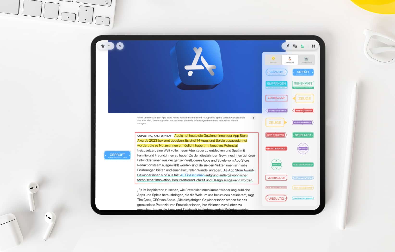 Die praktischen AI-Funktionen sind sehr hilfreich, aber optional. UPDF bietet eine Vielzahl an Funktionen, mit denen ihr PDF-Dateien nach euren Wünschen bearbeiten könnt. Unter anderem könnt ihr Text annotieren und kommentieren, Wörter und Abschnitte mit einem Highlighter markieren, Texte löschen oder ändern oder auch neuen Text hinzufügen. Für eine bessere Visualisierung lassen sich Fotos ins das Dokument einfügen, verkleinern und frei platzieren.