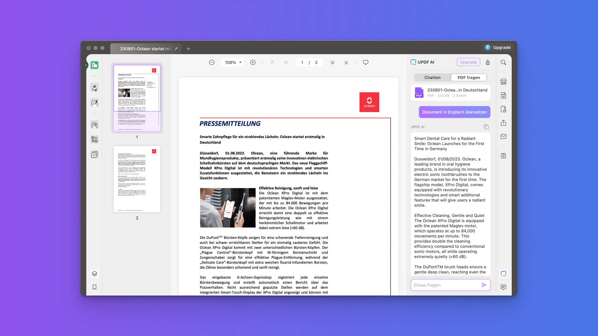 UPDF AI kann kostenlos verwendet werden, in der Free-Version sind die PDF-Uploads und Anfragen aber begrenzt. In der Pro-Version ist der neue AI-Assistent, der auf Künstliche Intelligenz setzt, enthalten und kann eure hochgeladenen PDF-Dokumente analysieren und dann zum Beispiel eine Zusammenfassung für euch schreiben. Und das funktioniert echt gut, hier werden die wichtigsten Sätze zusammengetragen. Bei besonders großen PDF-Dokumenten spart man so viel Lesezeit.